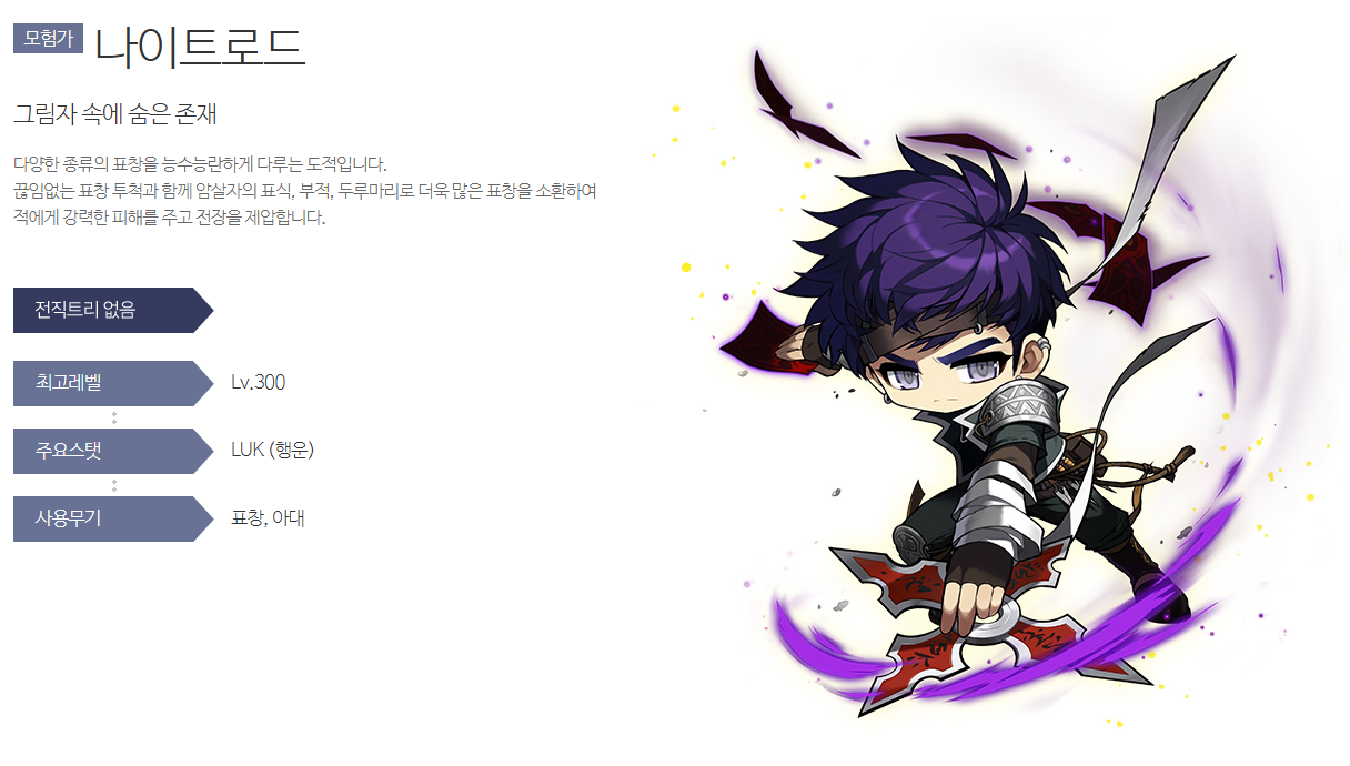 - 도적 계열 대표 직업으로, 지금도 상위권 보스 딜러로 많이 선택됩니다.
