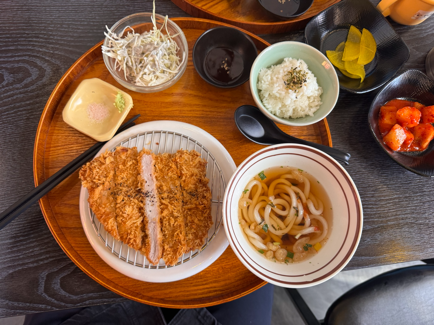 황금빛으로 바삭하게 튀겨진 안심카츠가 철망 위에 올라가 있어 눅눅함 없이 그대로 서빙됩니다. 밥, 가락우동, 양배추 샐러드, 단무지, 깍두기, 카츠 소스까지 알차게 구성된 세트예요.