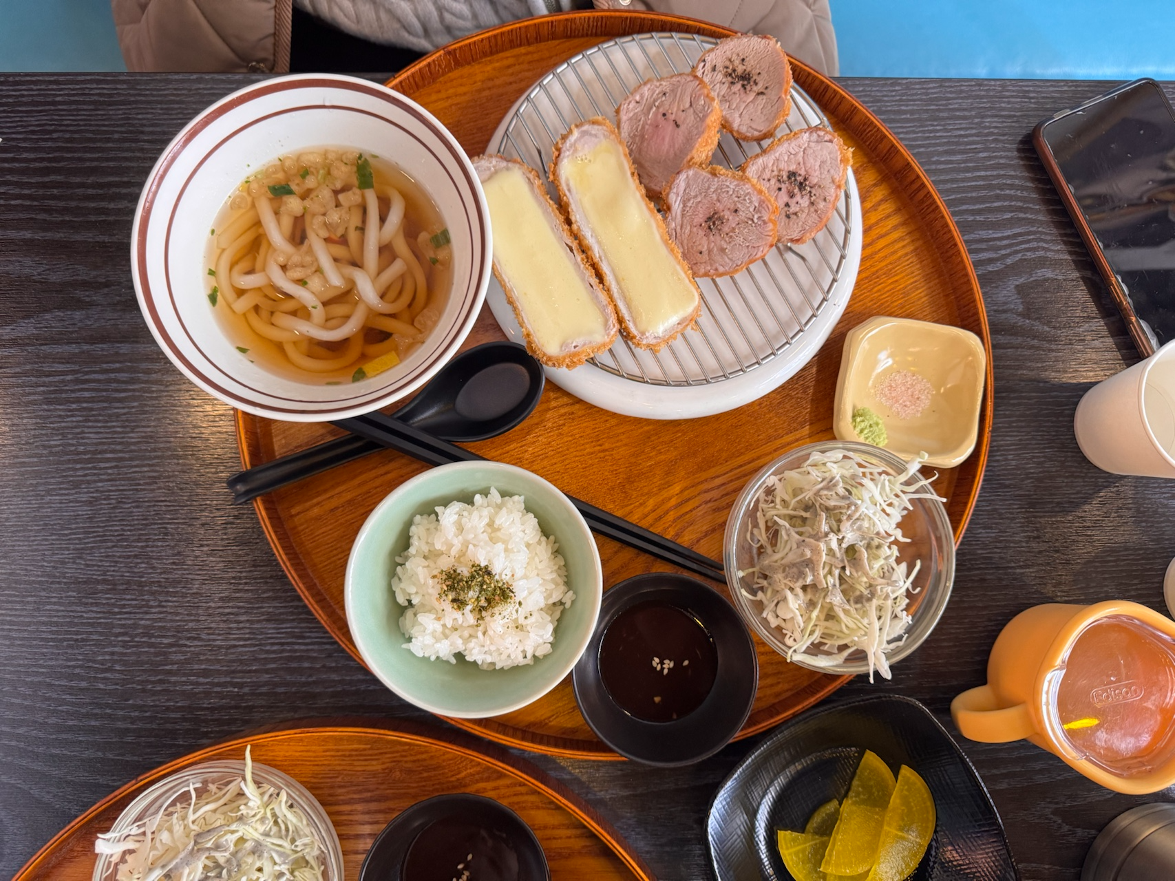 치즈카츠의 단면을 보면 안에 치즈가 가득! 끊어지는 단면이 정말 먹음직스러운 비주얼이에요. 안심 부위 특유의 부드러운 식감과 진한 치즈의 조화가 환상적이고, 함께 나온 가락우동은 깔끔한 국물에 쫄깃한 면이 카츠와 잘 어울려서 마지막까지 맛있게 먹었어요.